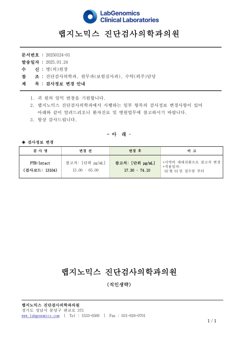 공문[20250124-01호]PTH-Intact 검사정보변경 안내 최고관리자 2025-01-24 13:58:39 최고관리자 0 596 2025.01.24 13:58 2025.03.21 12:53 공문[20250124-01호]PTH-Intact검사정보변경안내.pdf (125.7K) 공문[20250124-01호]PTH-Intact 검사정보변경 안내에 대하여 공유드리오니 업무에 참고하시기 바랍니다.