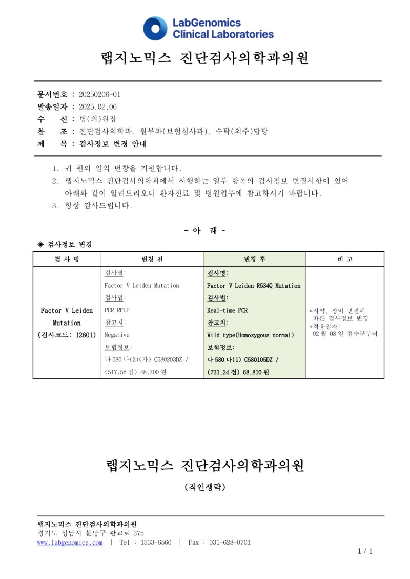 공문[20250206-01호]Factor V Leiden 검사정보변경 안내 최고관리자 2025-02-06 12:57:18 최고관리자 0 531 2025.02.06 12:57 2025.03.21 12:52 공문[20250206-01호]FactorVLeiden검사정보변경안내.pdf (132.0K) 공문[20250206-01호]Factor V Leiden 검사정보변경 안내에 대하여 공유드리오니 업무에 참고하시기 바랍니다. 1. Factor V Leiden 검사정보변경 시약, 장비 변경에 따른 검사명, 검사법, 참고치, 보험정보 변경