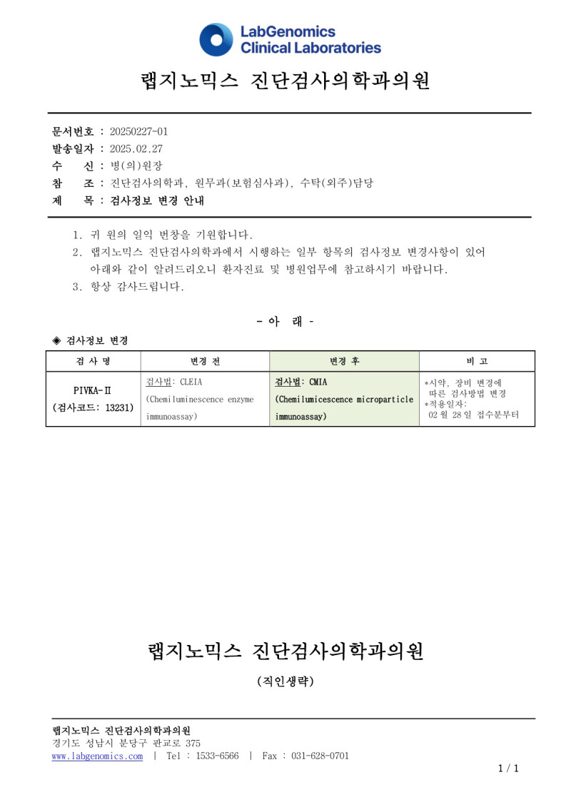 공문[20250227-01호]PIVKA-2 검사정보변경 안내 최고관리자 2025-02-27 16:57:54 최고관리자 0 438 2025.02.27 16:57 2025.03.21 12:51 공문[20250227-01호]PIVKA-2검사정보변경안내.pdf (128.0K) 공문[20250227-01호]PIVKA-2 검사정보변경 안내에 대하여 공유드리오니 업무에 참고하시기 바랍니다. 1. PIVKA-2 검사정보변경 시약, 장비 변경에 따른 검사방법 변경