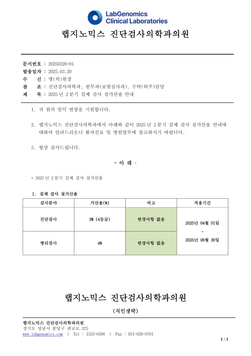 공문[20250320-01호] 2025년 2분기 검체 검사 질가산율 안내 최고관리자 2025-03-20 10:43:58 최고관리자 0 354 2025.03.20 10:43 2025.03.21 12:50 공문[20250320-01호]2025년2분기검체검사질가산율안내.pdf (113.3K) 공문[20250320-01호] 2025년 2분기 검체 검사 질가산율에 대하여 공유드리오니 업무에 참고하시기 바랍니다.