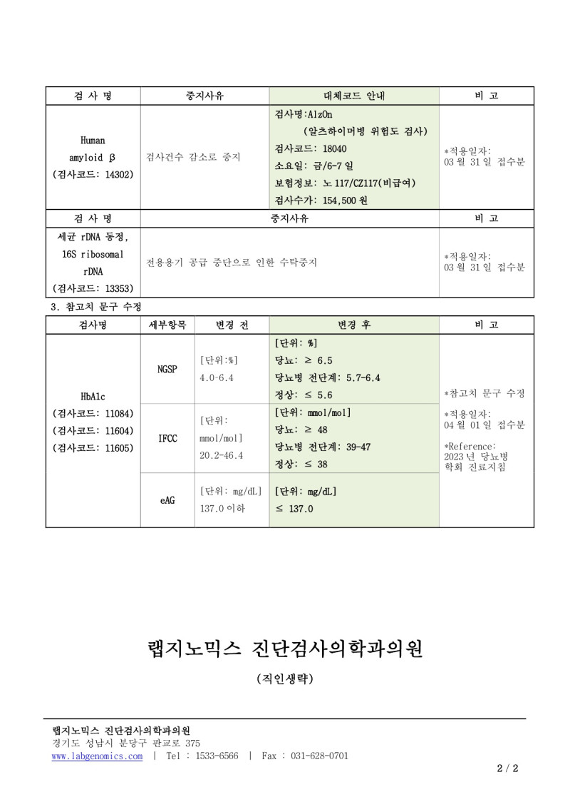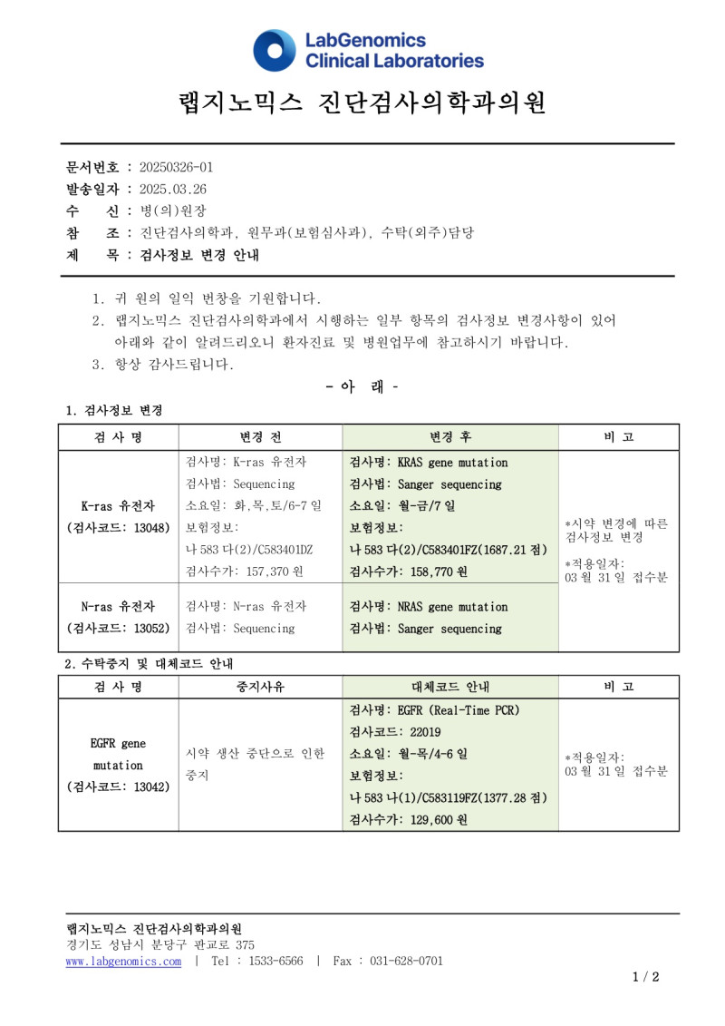 공문[20250326-01호]K-ras외 7종검사정보변경 안내 최고관리자 2025-03-26 14:41:57 최고관리자 0 286 2025.03.26 14:41 2025.03.26 14:41 공문[20250326-01호]K-ras외 7종검사정보변경 안내.pdf (169.5K) 공문[20250326-01호]K-ras외 7종검사정보변경 안내에 대하여 공유드리오니, 업무에 참고하시기 바랍니다. 1. 검사정보변경 안내 - K-ras 유전자 - N-ras 유전자 2. 수탁중지 및 대체코드 안내 - EGFR gene mutation - Human amyloid β - 세균 rDNA 동정, 16S ribosomal rDNA 3. 참고치 문구 수정 - HbA1c